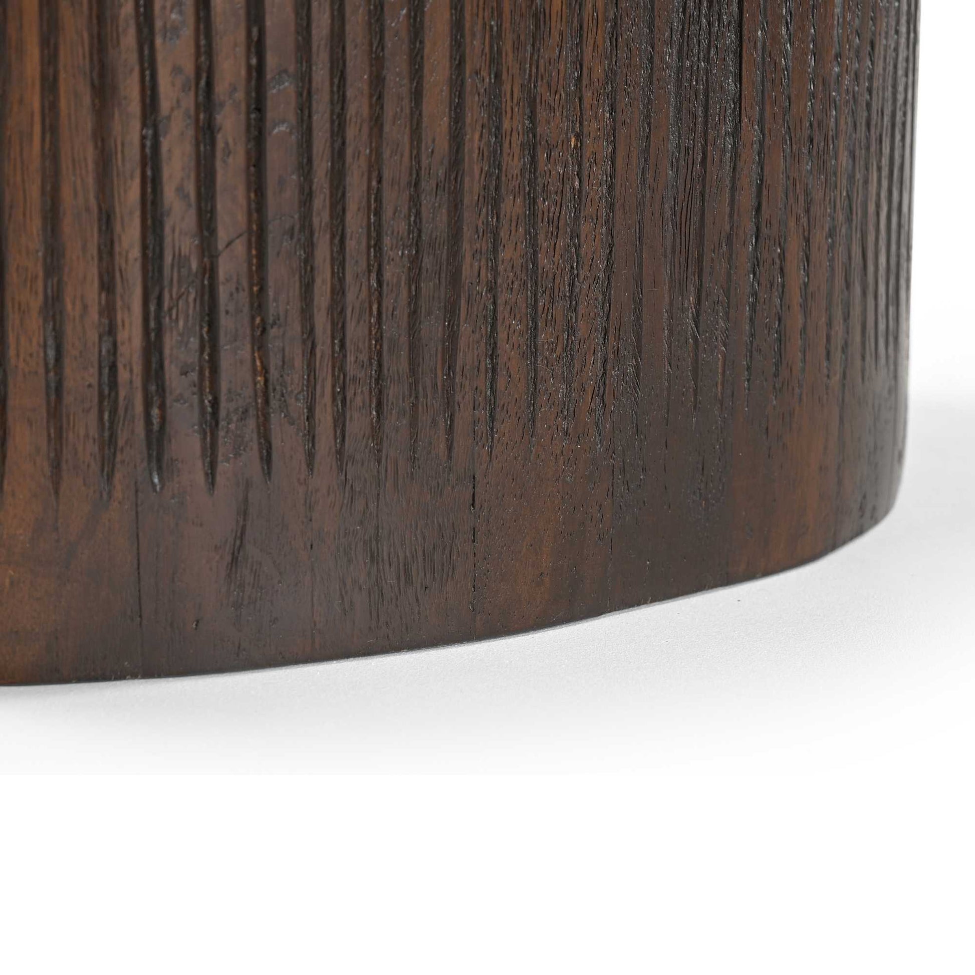 Bijzettafel Noel is gemaakt van mangohout in de kleur bruin en heeft een blad van marmer. Het ovale marmeren blad rust op een stevige, afgeronde voet met verticale groeven in het hout. Het contrast tussen het donkere hout en het grijze marmer geeft de tafel een karakteristieke uitstraling.