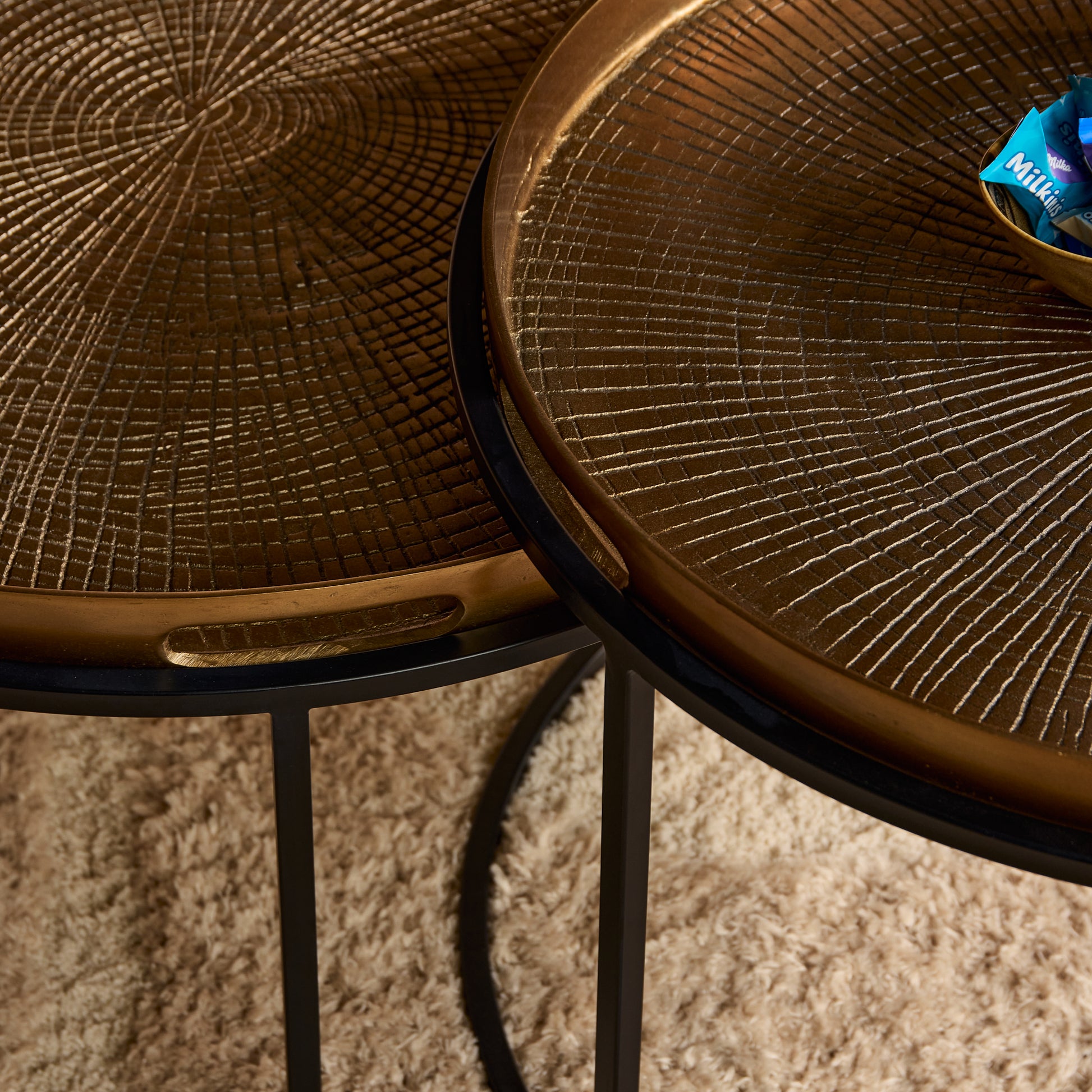 De salontafelset Julie bestaat uit twee tafels met een elegant en praktisch ontwerp. De tafelbladen zijn gemaakt van aluminium met een stijlvolle koper kleur, wat een warme en luxe uitstraling geeft. Deze set van twee tafels is ideaal voor zowel kleinere als grotere ruimtes.